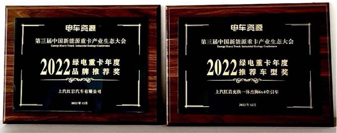 上汽红岩荣获2022绿电重卡“年度品牌推荐奖”及“年度推荐车型奖”