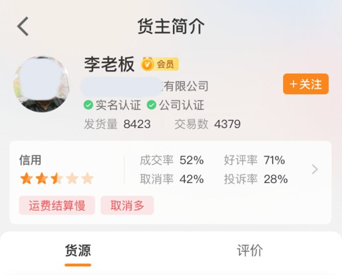同时,平台还将同步展示货主的正负向标签。结合信用分指标情况,信用等级高的货主会展示正向标签如:运费结算快、投诉少等;信用等级低或不达标的货主则会在显著位置展示负面标签如:运费结算慢、取消多等。司机可以通过直观展示的评价标签进行判断,更好的甄别优质货主。