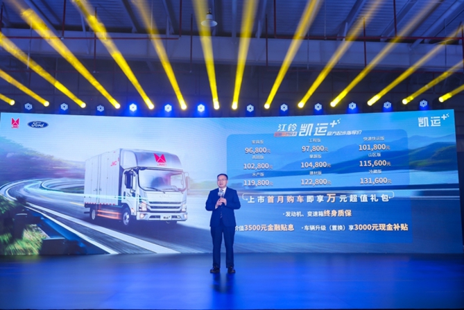 最引人注目的时刻莫过于当覆盖着的红绸被揭下,配合着舞台炫酷的灯光,凯运+正式亮相,令线上、线下观众深感震撼。随后,江铃汽车股份有限公司副总裁兼江铃汽车销售有限公司总经理刘让坡对凯运+价格及配套优惠政策进行了揭晓,凯运+家具版,售价为96800;凯运+工程版,售价为97800;凯运+快递快运版,售价为101800;凯运+商超版,售价为102800;凯运+果蔬版104800;凯运+山区版,售价为115600;凯运+水产版,售价为119800;凯运+建材版,售价为122800;凯运+冷藏版,131600。上市首月购车,即享万元超值礼包:发动机、变速箱享终身质保,可享3482元金融贴息,车辆升级(置换)可享3000元现金补贴。