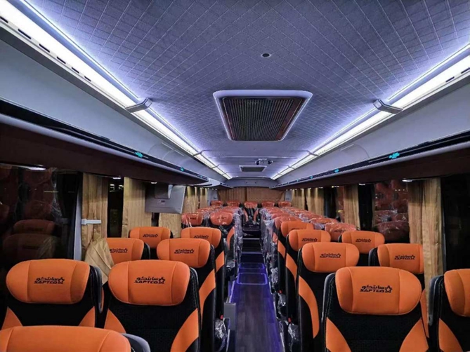 为适应沙特炎热干燥的气候和车辆运营里程长,强度大等特点,宇通研发团队深入当地进行调查研究,对该批车型进行了高度定制化的调整和改进。在动力系统上,宇通创新性地使用AMT变速箱,匹配大马力发动机改善长途驾驶的行驶质感;同时为了给车辆带来更多的承载空间,提升单程载客能力,宇通将600L油箱布置在前轮前方区域,从而为车身留出充足的行李舱空间,满足当地居民长途乘坐携带行李的需求。此外,车辆还搭载了宇通独有的二代热管理技术,有效提高了整车的舒适性和运营经济性,车内则统一配备了42000KCAL 空调,制冷速度及制冷效果表现优异,为司乘人员带来了清凉舒适的乘坐体验。