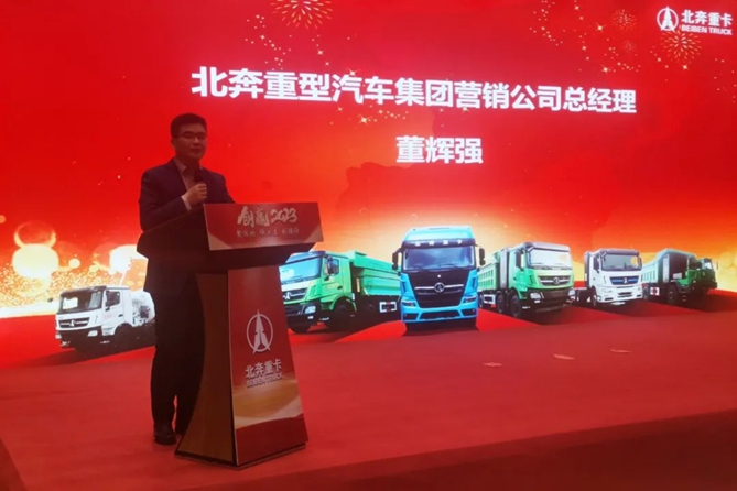董辉强在会上重点回顾了鲁豫地区北奔重汽和经销商朋友厂企合作历程,他说,鲁豫一直以来是北奔重卡的传统优势区域,在这有超过20年的合作伙伴也有刚加盟的新的经销商,传承与启程是北奔重卡做好区域市场的根本保证。此次年会一方面是总结回顾过去一年的得与失,更重要的是展望2023创赢2023。他在会上还就北奔重汽2023年推出的几款产品进行了重点说明。