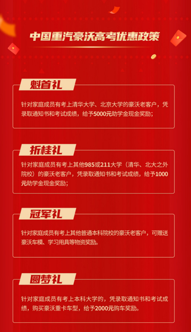 活动期间,中国重汽豪沃将为考生家庭提供魁首礼、折桂礼、冠军礼等助学礼遇,针对有家庭成员被清华大学/北京大学、985/211大学、其他本科院校录取的客户,分别给予5000、1000和车模、学习用品等奖励;凡家庭成员有考上本科院校的豪沃老客户,购买豪沃卡车给予2000元购车奖励的“寒窗圆梦礼”,倾情回馈,限量放送,领取要趁早。