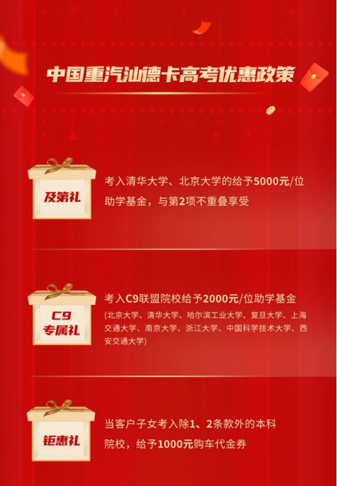 凡汕德卡客户子女考入除1、2条款外的本科院校,给予1000元购车代金券;