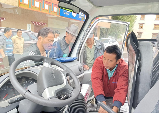 在甲居镇,服务人员一一走访了当地的用车单位,经过多番了解,得知藏族同胞们对于这批江淮1卡国六环卫车均存在使用不够了解,保养维护不清晰的情况。后续,江淮1卡服务人员在巴丹县近20个乡镇走访,了解使用情况,得到的结果与甲居镇是相似的。据此,江淮1卡服务人员决定开展一场国六专项的技能培训工作,指导当地驾驶员熟练操作这批车型,以及如何开展日常养护,并进行难点疑点解释。