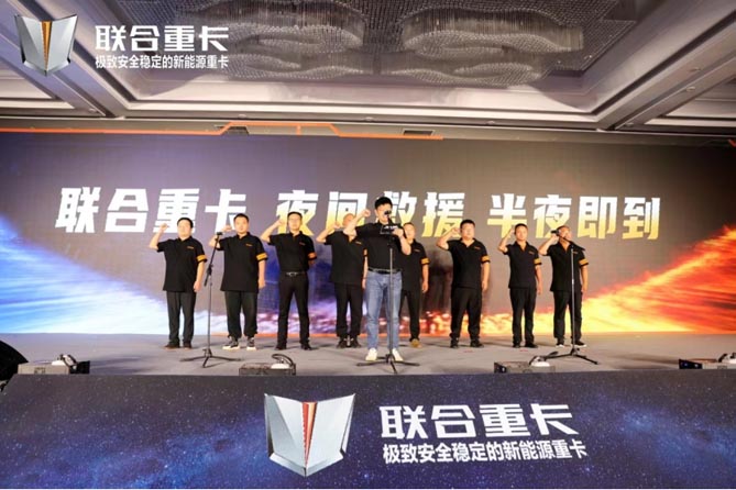 客户的生意就是联卡人的命!在联合重卡营销公司副总经理周孝恩的带领下,联合重卡全体工作人员、经销商、合作伙伴高举右手共同宣誓:“我们因为共同的责任,郑重承诺:联合重卡,夜间救援,半夜即到 !”激昂的誓言响彻狮城!