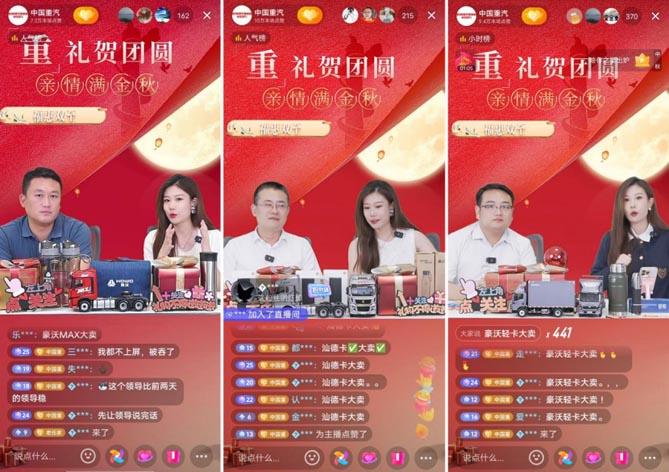 活动期间,中国重汽官方抖音直播间分别举办了豪沃、汕德卡和HOWO轻卡三场直播活动,人气主播坐镇,三大品牌销售总经理、产品经理空降直播间,带来专业的行业解读和产品讲解,并公布三大品牌福利政策;与网红卡友倾情连线,让观众沉浸式感受中国重汽产品的魅力;更有直播话题互动,天南海北话双节,公屏趣闻妙谈不断,氛围拉满。