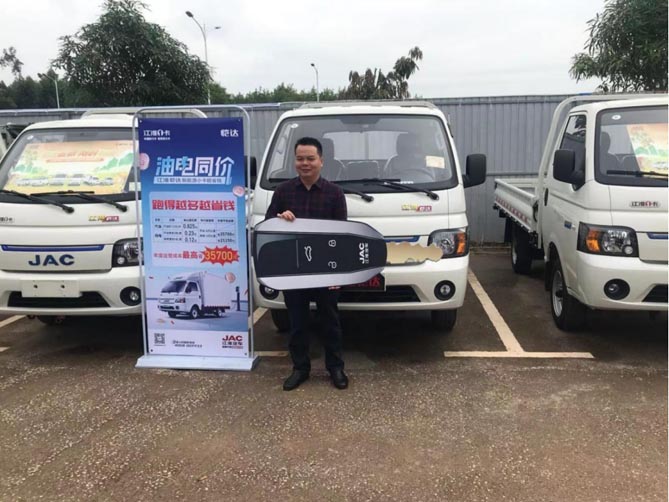 经营汽车零部件销售的马老板也特地赶在此次活动前来增购江淮1卡恺达42度纯电小卡。为什么偏爱江淮1卡新能源?原来早在2017年,他就购买了江淮1卡新能源小卡,是江淮1卡新能源的老客户。这辆新能源小卡行驶了30多万公里没出过任何问题,所以马老板非常信赖江淮1卡新能源小卡,这次活动直接全款购买了恺达42度纯电小卡,喜提爱车。