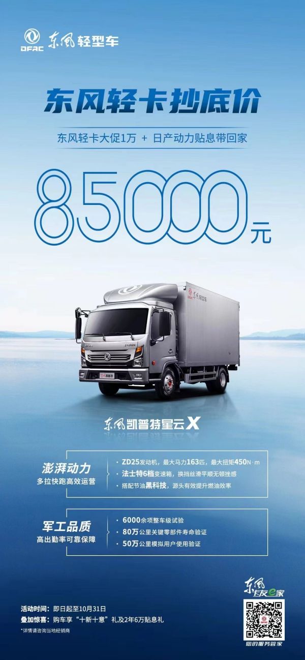 面对如此优惠政策,相信不少卡友已经心动了。别急,还要让卡友们收下这颗购车安心丸,必须郑重申明的是:价格打折,但品质不打折,东风凯普特星云X延续了东风轻型车的军工品质,历经6000余项整车试验、80万公里关键零部件寿命验证和50万公里模拟用户使用验证,为保障卡友高出勤率做足了功夫,妥妥的轻卡实力标杆。此外,东风轻型车广受卡友好评的“真美满”服务也将随车赠卡友,承诺不打折,服务永在线。好了,时间有限,卡友们赶紧联系本地经销商,预约试驾购车,礼享钜惠吧。