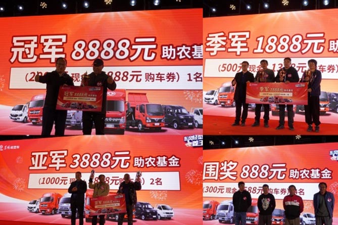 只要你认为你的生姜个头大、品相好,你就能参与进赛事中,在百位姜农的激烈比拼中,有十位姜农“杀”进了总决赛。在最终评比现场,有四位选手获得入围奖888元助农基金(300元现金+588元购车券),有三位选手获得季军1888助农基金(500元现金+1388元购车券),有两位选手获得亚军3888元助农基金(1000元现金+2888元购车券),有一位斩获冠军8888元助农基金(2000元现金+6888元购车券)。东风轻型车真切有力的惠农使姜农们喜笑颜开,让姜农们感受到了东风品牌的温度。
