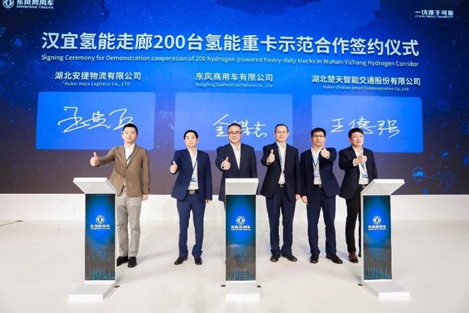 谋定而后动,兴一域而利天下。在发布会中,东风商用车有限公司、湖北楚天智能交通股份有限公司(下简称“楚天高速”)、湖北安捷物流有限公司(下简称“安捷物流”)签订汉宜氢能走廊200台氢能重卡示范合作项目。