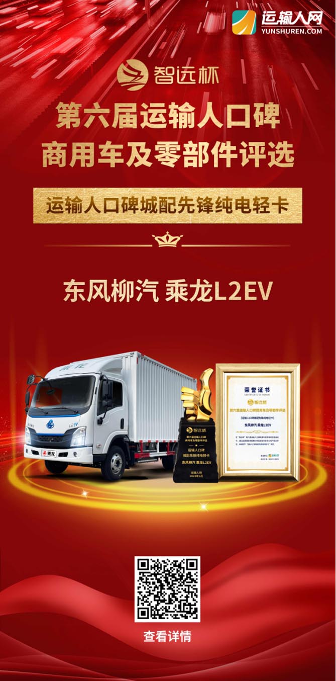 1月9日,由运输人网举办的第六届“智远杯”运输人口碑商用车及零部件评选揭晓了最终的获奖名单。其中,乘龙L2EV凭借其卓越的性能和良好的口碑,荣获“城配先锋纯电轻卡”奖项。