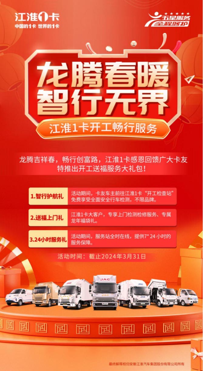智行护航礼:即日起至3月31日,卡友/车主前往江淮1卡“开工检查站”即可免费享受全面安全行车检测,不限品牌。龙年开工送上第一份礼祝您龙行龘龘,前程朤朤!
