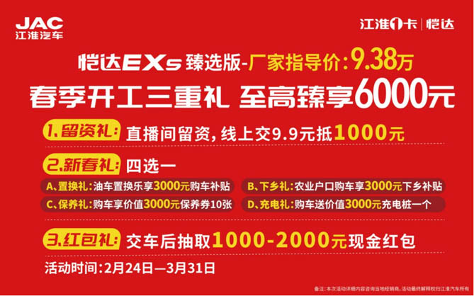 恺达EX5臻选版采用线上直销模式,全网统一价,最大程度让利用户,让您买得省!2024年2月24日-3月31日,参与活动领取春季开工三重礼,将新车开回家!