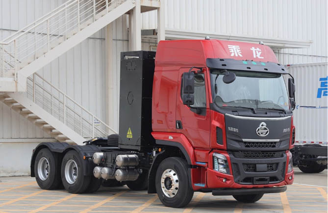 乘龙H5新能源重卡包含充换电一体牵引车、纯充电牵引车两大系列,提供282~423kW·h电池容量的产品组合,动力覆盖360-460kW,为用户提供全场景零碳、高效、低耗运输解决方案。