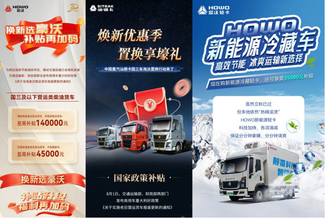 在当今物流运输行业的激烈角逐中,追求高效率、高品质、高标准的运输服务已成为不可阻挡的时代潮流。中国重汽积极响应国家号召,精准捕捉行业脉搏,在国家补贴政策基础之上,8月份全面推出各车型置换及新购的福利政策。这一举措大幅减轻了客户购车的经济负担,助力加速实现车辆升级和竞争力提升,赢得了广大客户的深切信赖与广泛赞誉,激发了市场的强烈反响与购车热情。