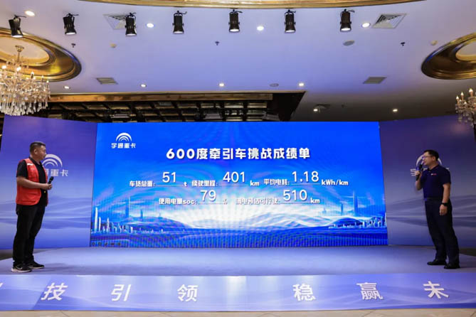 在发布会之前,宇通重卡600度牵引车进行了一次信心十足的实况续航挑战。车辆在实况运输场景下满载51吨全程历时10小时往返广西贺州、梧州两地,凭借一次充电轻松长续航的实力,最终以1.18度/公里的电耗表现完成401公里长续航挑战,车辆使用SCO值为79%,满电预估可行驶最长里程为510公里。真实场景、真测挑战、现场公布成绩,不仅展现出宇通600度牵引车的硬核实力,更展现出宇通重卡说到做到的价值承诺。