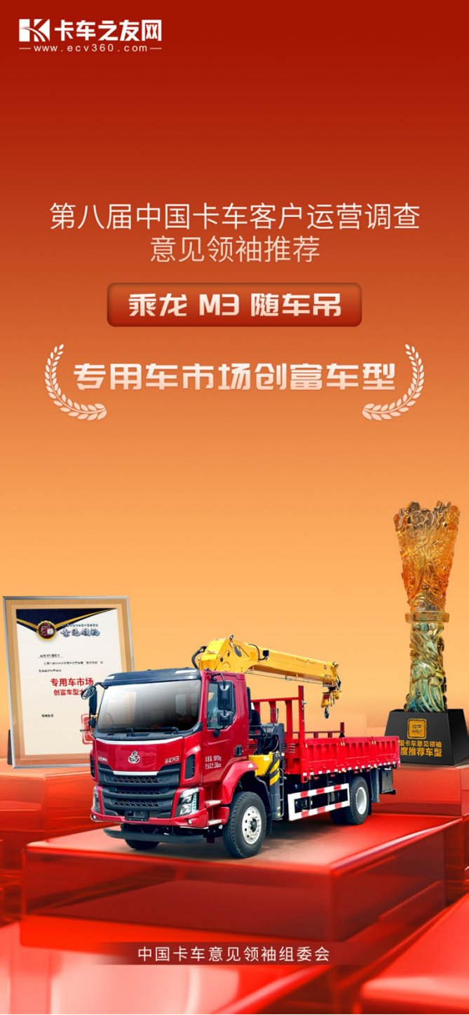 金杯银杯不如老百姓口碑,金奖银奖不如用户夸奖!2024年12月27日在北京举行的“第八届中国卡车客户运营调查——意见领袖颁奖盛典”上,来自东风柳汽的乘龙M3随车吊荣膺“专用车市场创富车型”大奖。
