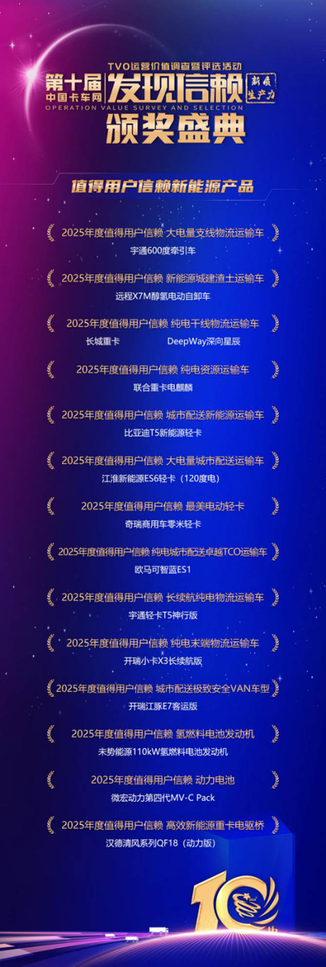 此次第十届发现信赖评选活动就聚焦新质生产力,探寻挖掘和表彰那些在各自细分领域中表现出色的卡车及零部件技术、产品,推动行业向低碳、高效、智能的方向发展,为用户举荐值得信赖的细分领域新质生产力。