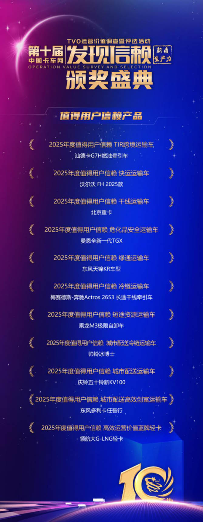 2024年,尽管卡车行业发展并不乐观,但是商用车企业积极破局,不断思变求变,在技术创新中大力发展新质生产力,在危机中孕育发展机遇,在细分领域频传佳绩。第十届发现信赖评选活动以实际运营场景为基础,评选出了2025年度值得用户信赖产品奖、鼎新奖、海外奖,以及2024年度值得用户信赖的物流先锋企业奖。