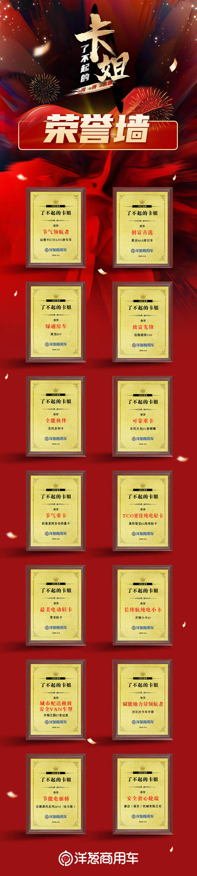 了不起的卡姐,了不起的女性,在卡姐一步步成长的过程中,离不开每一台品质过硬的车辆,也离不开始终关注卡姐群体的商用车及零部件品牌。在颁奖盛典之上,由“了不起的卡姐”推荐产生的各大奖项也逐一揭晓:
