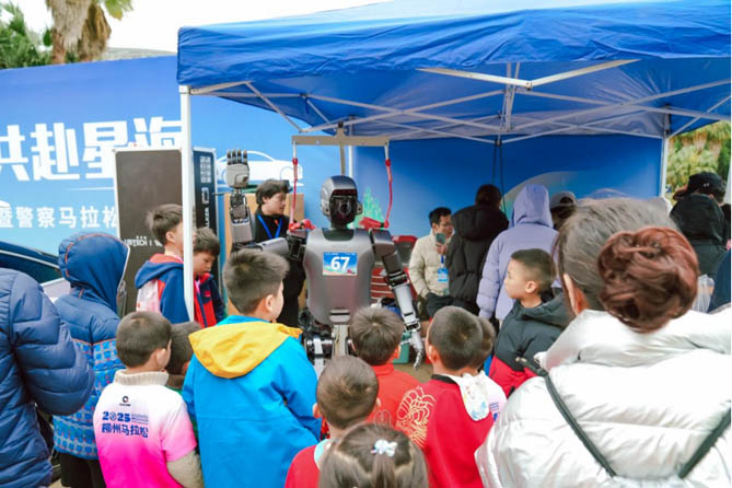 在全马/半马、欢乐跑的终点,2位数字化员工守候在乘龙展台旁,以科技感十足的形象和生动讲解,向观众们展示乘龙卡车的卓越性能。这一独特的展示方式迅速吸引了众多跑友的目光,大家纷纷驻足围观,并与智能机器人及展车合影留念,现场气氛热烈。