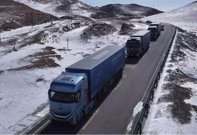 无论是西安至霍尔果斯的国内段征程,还是穿越阿拉木图、比什凯克的海外路段,欧曼银河重卡皆无惧“高原、高寒、高坡”的“三高”考验。面对青藏高原海拔3000米以上的缺氧环境,其智能增压系统通过ECU实时调节进气量,配合采埃孚变速箱TCU的协同控制,始终保持经济时速稳定前行。在海外征程中,面对多变气候、崎岖弯道等复杂路况,欧曼银河重卡动力依旧强劲,让驾驶员在险峻路况中尽在掌控、从容驰骋。