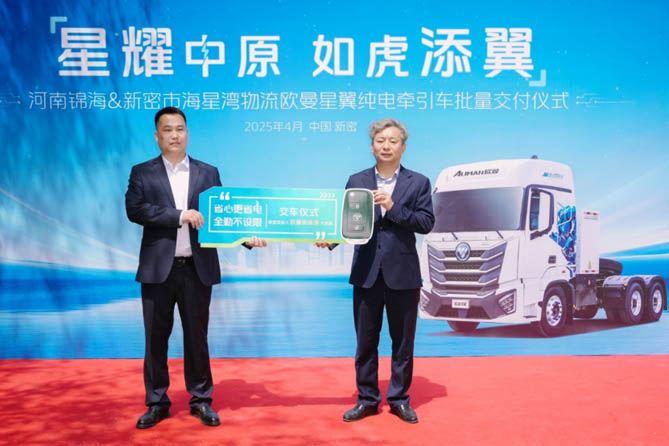 2025年4月17日,“星耀中原 如虎添翼——欧曼星翼纯电牵引车批量交付暨战略签约仪式”在河南新密市隆重举行。现场达成150台欧曼星翼400kWh纯电牵引车的战略合作签约,50台顺利交付。此次合作签约及交车,不仅标志着欧曼通过产品创新持续为客户提供精准解决方案,更为以河南为首的中原干线物流和区域集散运输市场提供更经济、更高效、更舒适的运营“利器”,书写绿色运力新篇章。