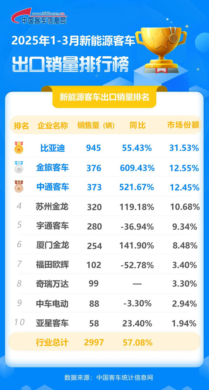 2025年1-3月份,中国新能源客车累计出口2997辆。其中,比亚迪以945辆的新能源客车出口量位居榜首,同比增长55.43%,市场份额达31.53%,以绝对优势领先行业。