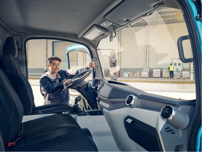 这一理念的落地,首先体现在产品设计上。以飞碟EF3为例,其“走街串巷下地库”的设计初衷,直击城市配送司机的痛点:6.6米转弯半径、2125mm整车高度、780mm低货台,让司机在狭窄街道与地下车库中灵活穿梭,走街串巷一把掉头;驾驶室外宽1750mm、中置座椅可放倒的设计,则从细节上缓解长途驾驶的疲劳。而EW7跨城旗舰车型搭载的“行业第一款气囊座椅”、“可变卧铺”和方向盘角度乘用化,更将司机的健康与舒适提升至乘用车标准。