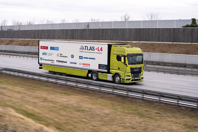【图注:通过曼恩与合作伙伴共同参与的ATLAS项目,第一辆自动驾驶卡车将于2024年中在德国高速公路上独立行驶。】