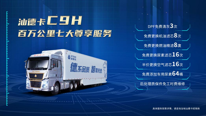 作为高端重卡的佼佼者,汕德卡C9H深入践行“客户满意是我们的宗旨”核心价值观,为客户带来全面领先行业的百万公里七大尊享服务,汕德卡C9H客户可在100万公里内享受DPF免费清灰3次、免费更换机油滤芯8次、免费更换燃油精滤8次、免费更换尿素滤芯16次、半价更换空气滤芯16次、免费添加车用尿素64桶、后处理质保件免工时费维修等超值尊享服务,不仅可省下一大笔车辆维护成本,更可享受四大总成核心零部件5年超长质保 ,其逻辑不言自明,实力才是大胆承诺的底气。