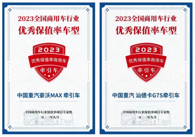 中国重汽的高光时刻还不止于此,9月22—23日,2023第七届中国二手商用车大会上,中国重汽豪沃MAX牵引车、中国重汽汕德卡G7S牵引车双双荣获“2023全国商用车行业优秀保值率车型”,中国重汽产品的极致产品力不仅赢得了终端的信赖,同时获得了行业权威的认证背书。