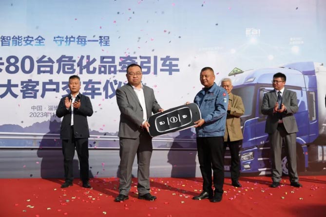 11月16日,山东淄博。在淄博市物流与供应链协会、行业客户代表等共同见证下,80台北京重卡危化品牵引车顺利交付山东淄博大客户。