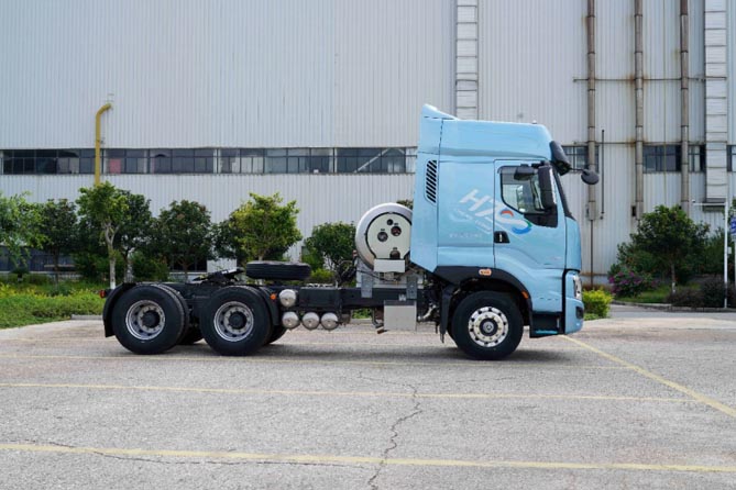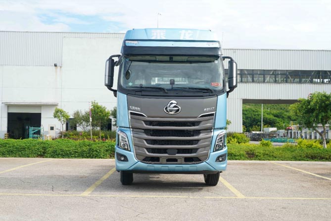 作为乘龙品牌的高端旗舰车型,乘龙H7 550LNG造型高端,外观大气,专属“冰晶蓝”车色,灵感源于美丽湖泊,寓意蓝天白云,共创美好生活。为了搭载燃气动力系统,专属定制4300mm超长轴距,可满足最大2.7米前回转半径需求,从容应对气瓶布置。同时搭载高强度宝钢车架,高承载的同时更适应气体机应用。