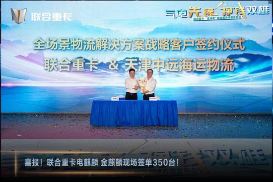 发布会现场气氛热烈,随着产品介绍和价格的公布,众多客户纷纷表达合作意向,签约仪式接踵而至,将活动推向了高潮。天津中远海运物流与联合重卡达成了深度战略合作,双方将以运输实体为支撑,在智慧物流与新能源前沿领域开展深度合作,实现优势互补与深度融合,共同开拓物流新纪元。
