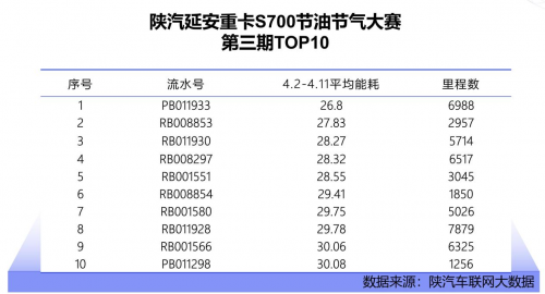 到了第三期比赛,竞争愈发激烈,据天行健智能车队管理系统的能耗数据显示,排名前八的车辆,平均能耗均稳定控制在百公里26-29L之间,更有车辆跑出了百公里26.8L、27.83L等的好成绩。对于重型卡车而言,如此低的能耗水平实属难得,这不仅意味着车辆运营成本能够得到大幅降低,更以实实在在的数据,彰显了延安重卡S700在节油节气方面的显著优势。