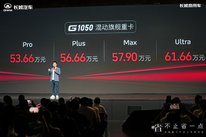 此次重磅上市的长城混动重卡G1050,搭载长城商用车全栈自研的芯片级动力大脑与双电机DHT混动专用变速箱,不仅能迸发1050匹强劲动力,更实现油耗直降15%-25%,真正做到动力更足、油耗更低,有效降低干线物流运输成本,完美诠释了“不止省一点”的产品内核。此外,针对干线普货物流及高时效快递场景的G970车型也即将上市,进一步满足多样化、多场景物流的需求。