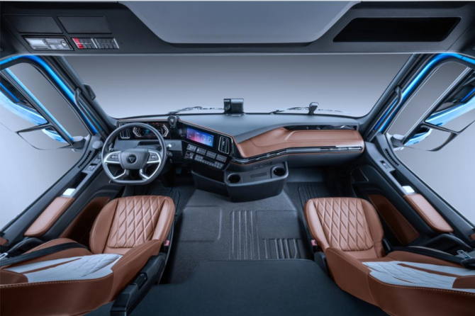 众所周知,驾驶室的舒适性对司机的驾驶效率至关重要。欧曼银河5 580燃气车采用全新内饰、时尚配色,为驾驶员打造了高标准驾驶环境。通过尺寸645mm,站立高度1835mm的驾驶空间,再加上双密封条设计大幅提升静谧性,让卡友舒享宽敞惬意座舱环境。可配置加热通风功能的座椅,无论冬夏都能让驾驶员坐得舒适;宽达1040mm 的超宽下卧铺,为驾驶员打造堪比居家卧室的休憩空间,有效缓解长途行车的肌肉疲劳与睡眠压力。