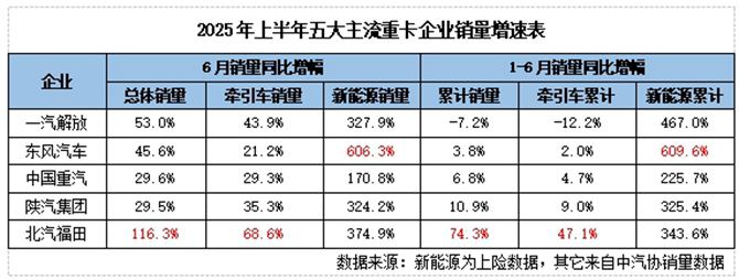 在决定未来话语权的新能源重卡领域,东风以1-6月累计609.6%的同比增速强势领跑,6月单月增幅更达606.3%,成为在新能源赛道跑的最快的传统豪强。解放则以467.0%的累计增速位居第二,福田、陕汽增速均超300%。这一赛道已初步形成“东风+解放”双龙头领跑格局。
