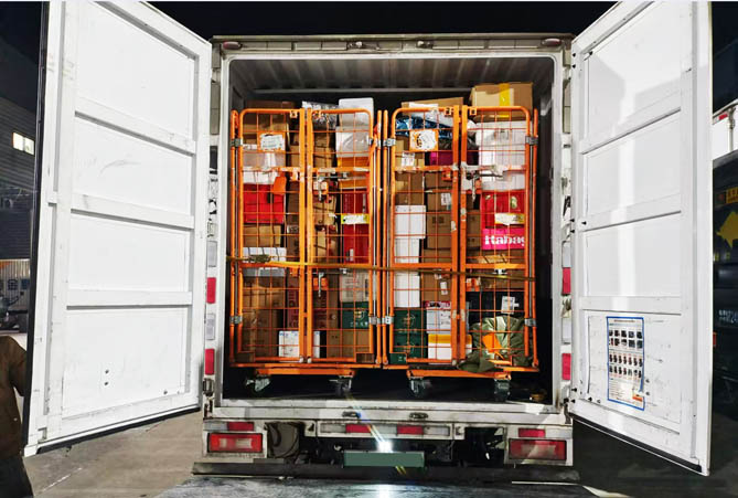 今心物流运营线路,主要是往返绍兴越城区、科桥区、诸暨等配送点。快递包裹大多属轻抛货,车辆到达转运点后,货物从输送线上下来,到货台用笼车装好,装卸人员落下车辆尾板,便将其送到厢车内。