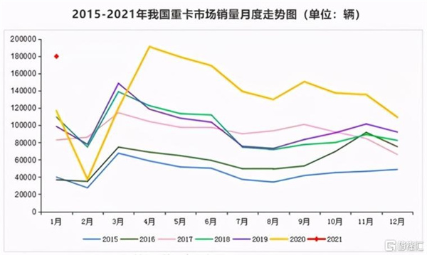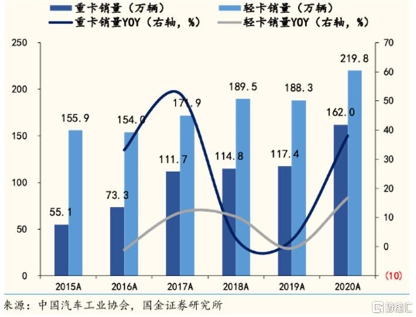 以卡车为例,2020年,累计销量397.47万台,同比增速达23.8%。其中,重卡销量达162万台,同比增速接近40%。